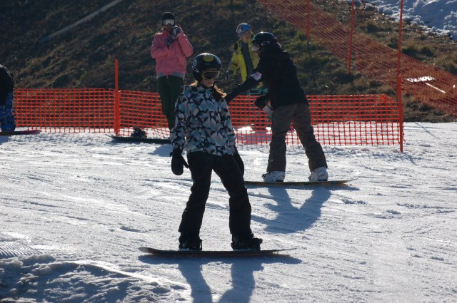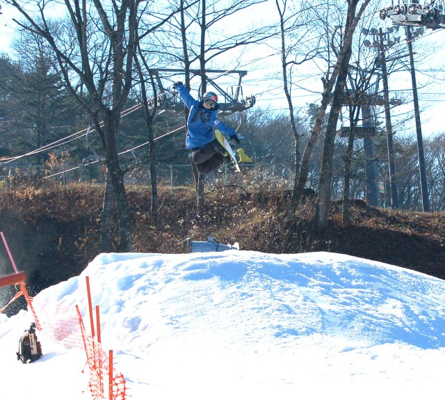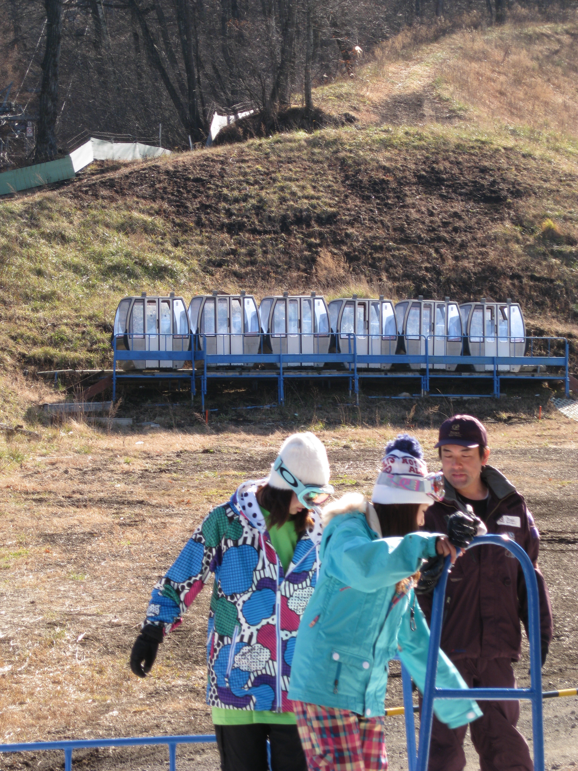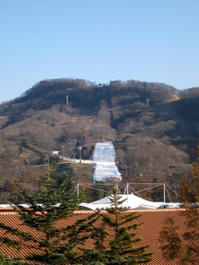A relaxing ride to the resort on the sleek bullet train. Uniformed women resembling flight attendants pass through the train selling food and magazines. I have a difficult time hearing the station stops but Offspring #1, the Nose of the this generation, knows exactly where we are at all times. Our stop. This couldn’t be it. There’s just one small strip of snow.
