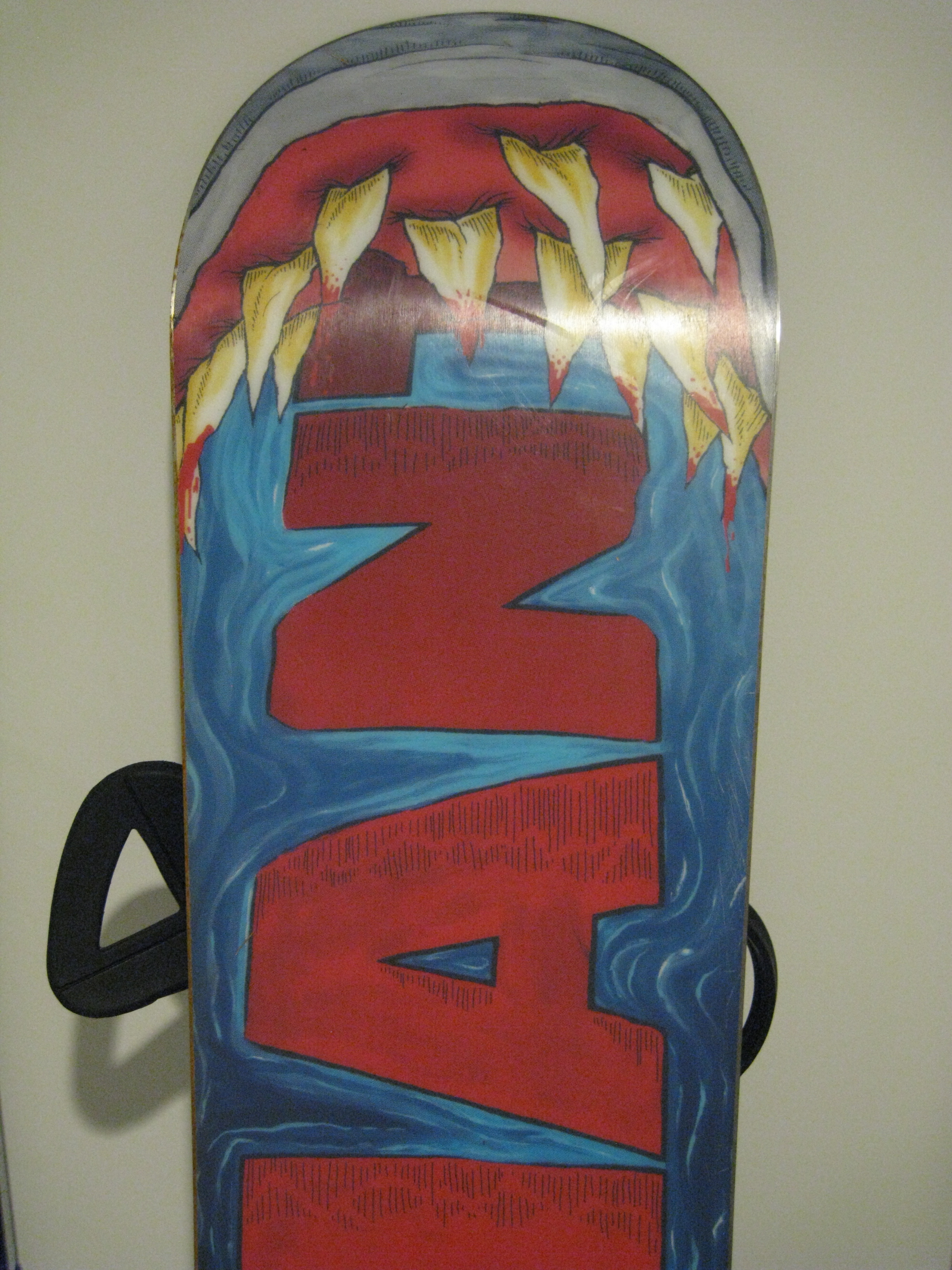 In a further twist of fetid fate, Offspring #2 grew 4 inches and her new snowboard from last year was now too short. Luckily for me and unfortunately for her, Offspring #1’s snowboard just barely fit her. She is now sporting a bloody Jaws snowboard.