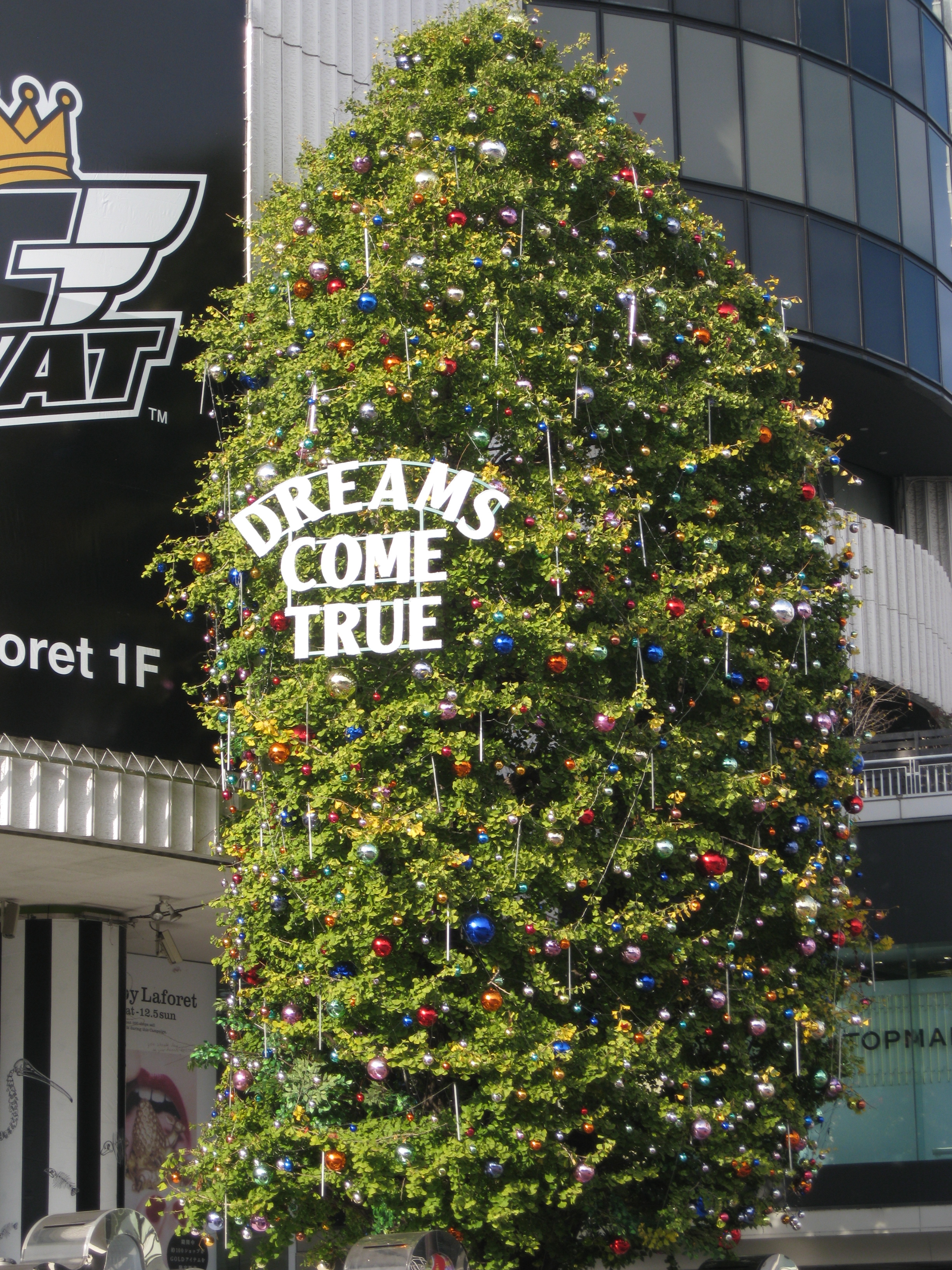 What would the holiday season be without a tree? Even my Jewish friends have one- which is removed when the in-laws arrive. Rockefeller center, the White House all boast trees with a pristine Americana pedigree. Lately these have come under fire for not being “green”. The US public must watch the lighting of countless giant trees and endure cities competing for greenest tree in the greenest city of all…. I think I found their Japanese counterpart. This is a really large specimen of the fir genus and species with Christmas decorations and a message that proclaims “Christian” sentiments of Christmas to a predominately Buddhist and Shinto population. It looks to me like it was a recycled version. I can hear the rationale now- ” We’ve got to cut this tree down for a building- I know, let’s use it for one of those big American type Christmas trees- it sort of has the right shape.”