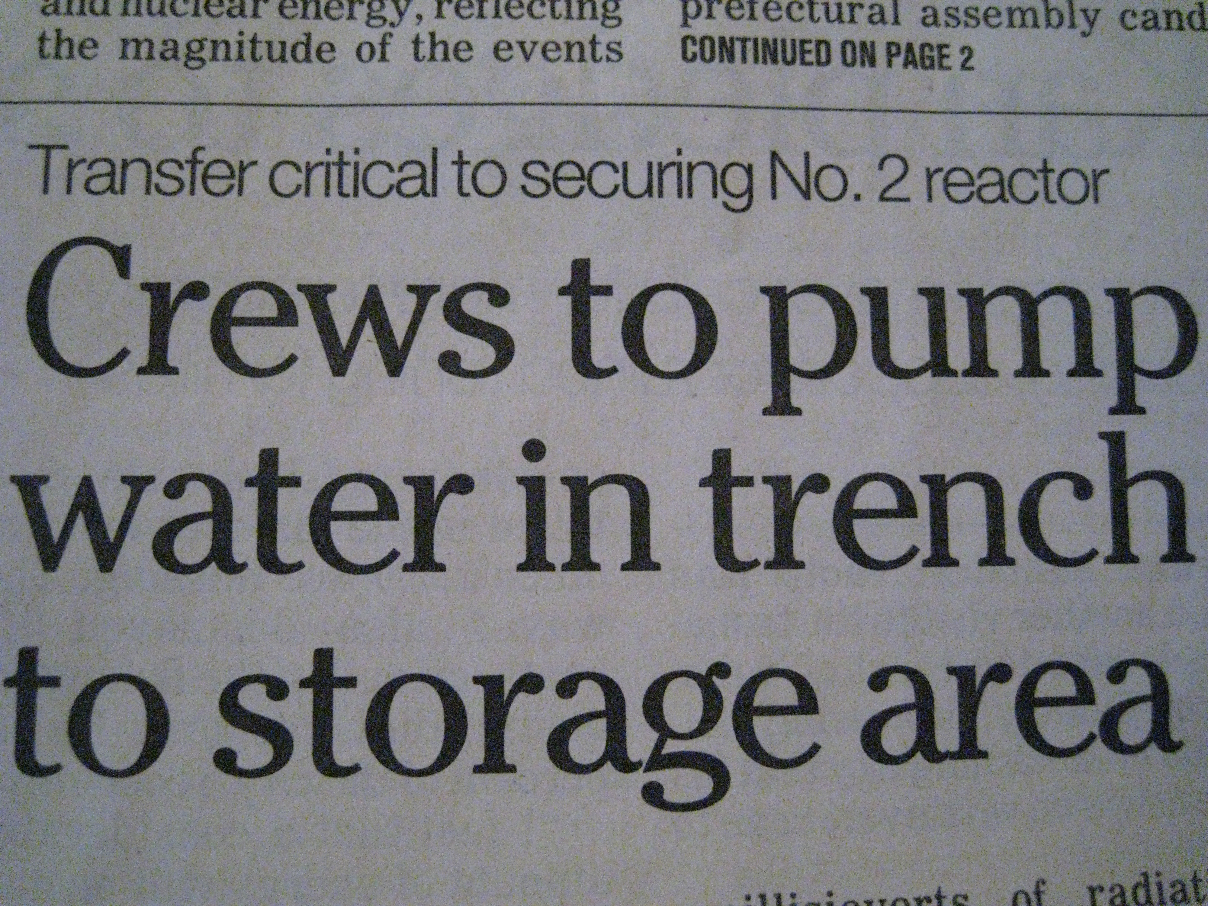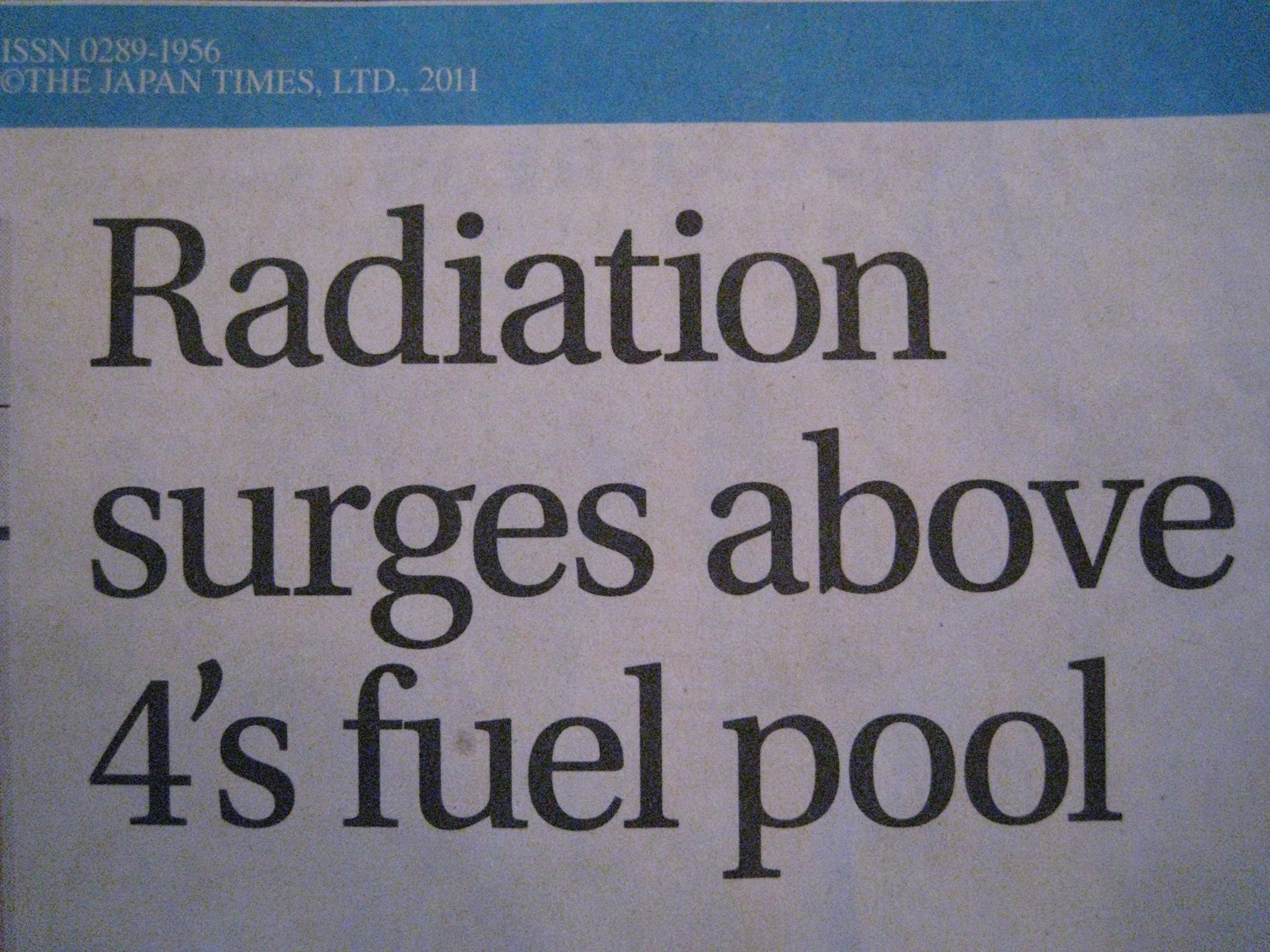 Next, peruse the paper for the latest update on the ever evolving power plant. Really, I would prefer a weekly summary as it usually involves one of the following: the power plant is burning, there’s been an explosion, it’s leaking, the rod’s are exposed, it’s hot, it’s all under control, repeat from the beginning several times.
