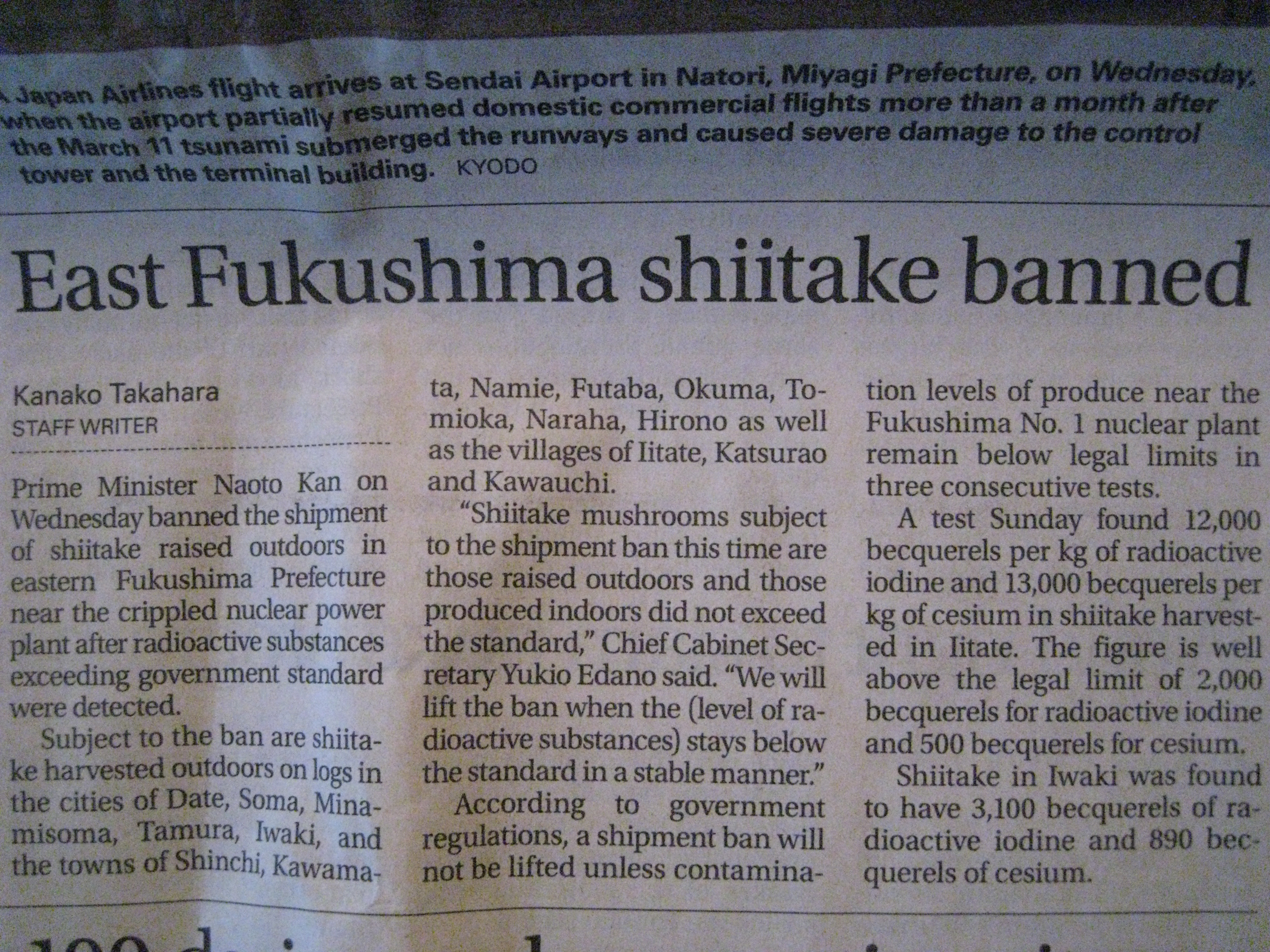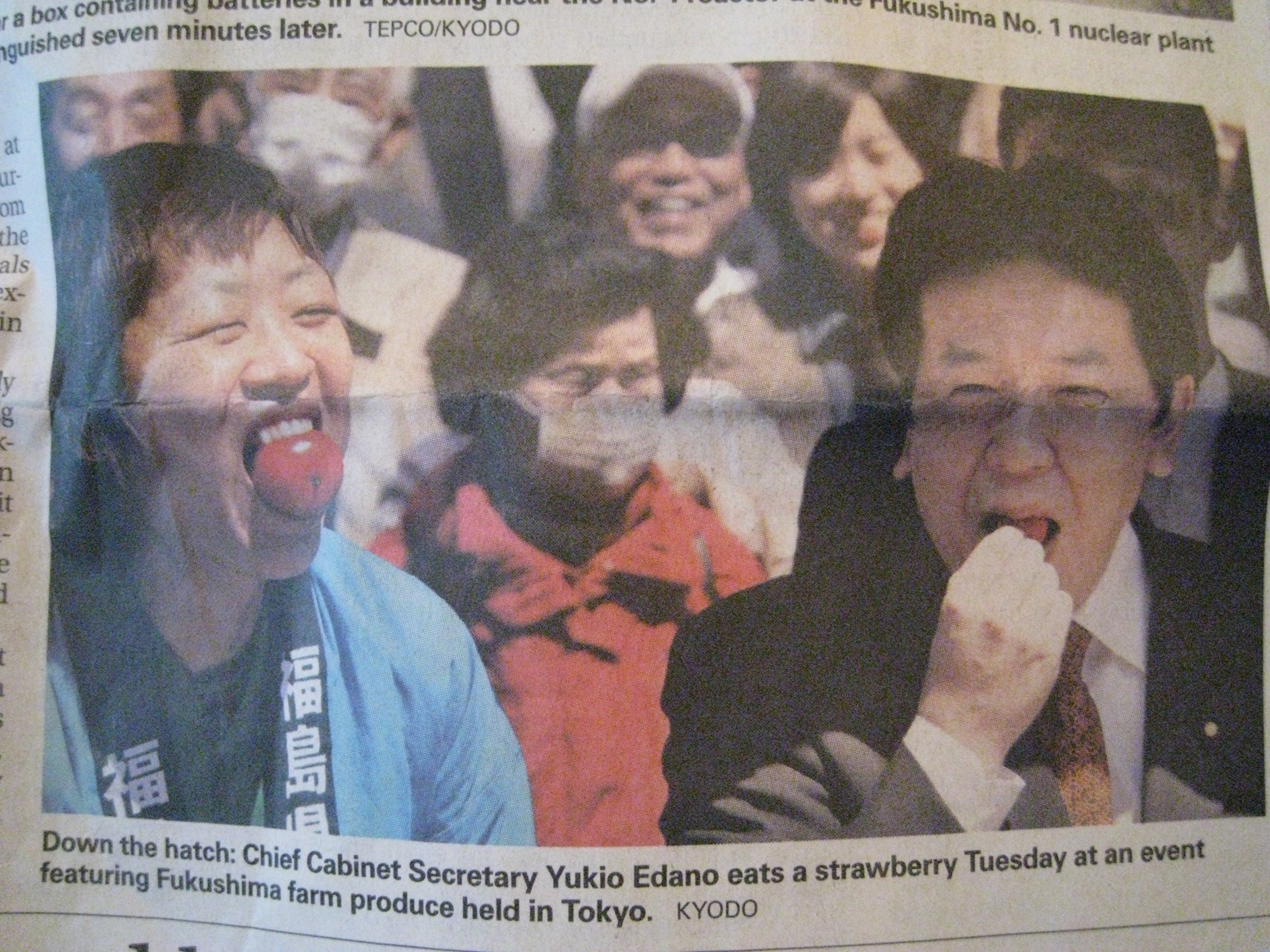 Keeping track of what food is off-limits is cumbersome. Much of the produce in Japan comes from the area around Fukushima. Immediately after the EQ, milk and spinach was banned, then it was lifted based on radiation levels being within healthy limits. Following that, milk was suspended and subsequently lifted. Now, shitake mushrooms grown outside are banned while those grown inside are acceptable. It’s getting somewhat confusing and difficult to follow, however, I would like to avoid scurvy if possible. Again, following the daily newspaper is useful as I can see what the Chief Cabinet Secretary Edano eats- assuming I can TRUST THE GOVERNMENT AND THIS IS NOT A CONSPIRACY THEORY….(many Japanese think Edano is actually leading Japan right not but alas, this is not a political blog…)