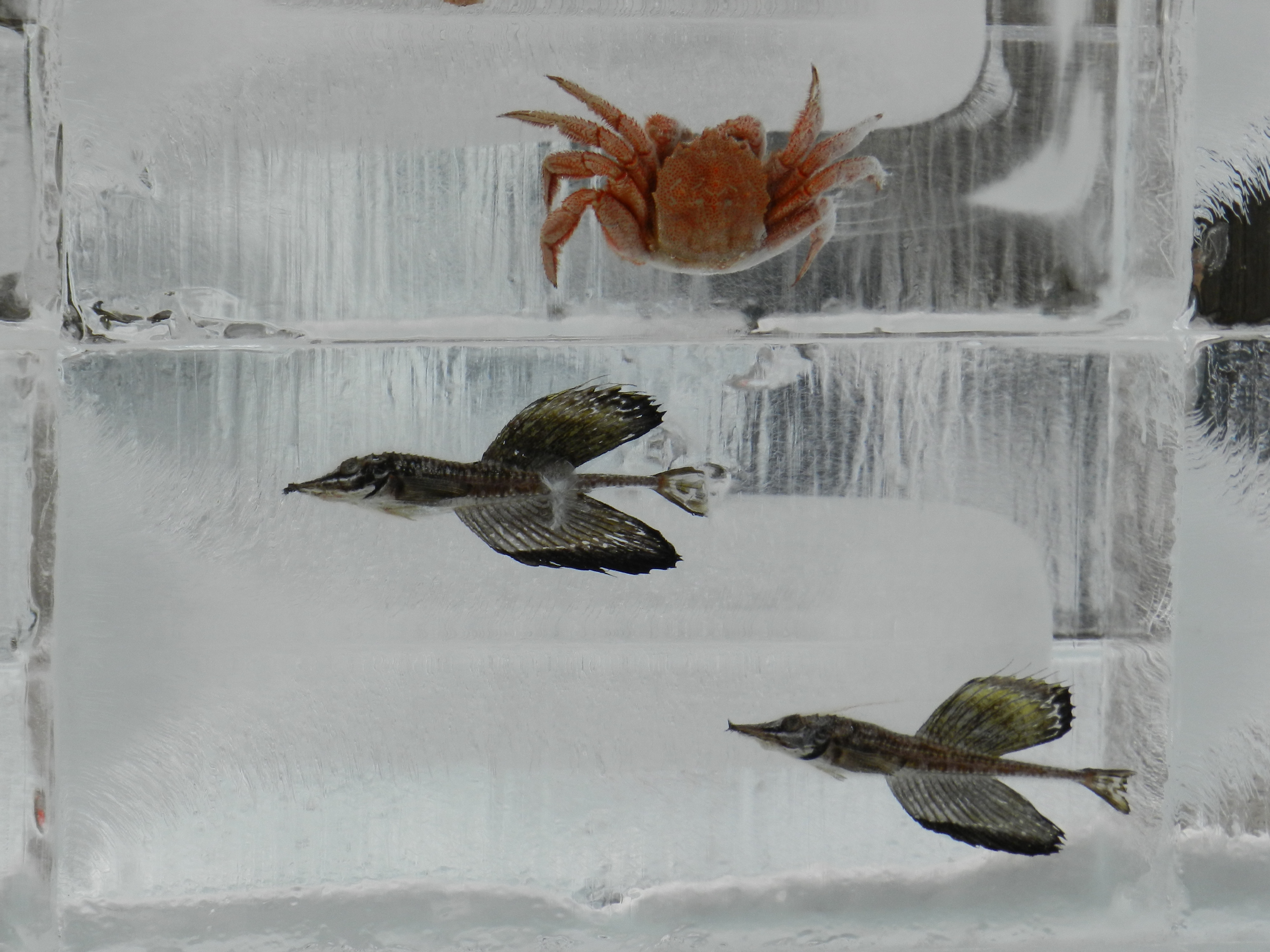How interesting! But what is going on with the fish and crabs? Are they artificial? Surely not real ones frozen into the ice:( Sitting here ready to get my Animal Protection gear into action.