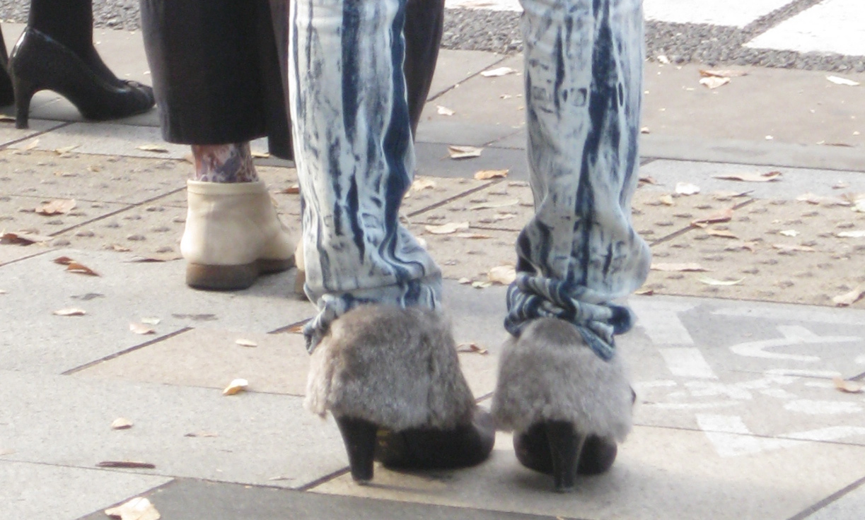 Fur leggings- not since the advent of UGG has anything made the leg look shorter and fatter. The Japanese solve for this by limiting the use of fur leggings to heels over 3 inches. It just looks like a wax gone bad,”Oops- family emergency- got to go- can we finish the rest of your leg later?”