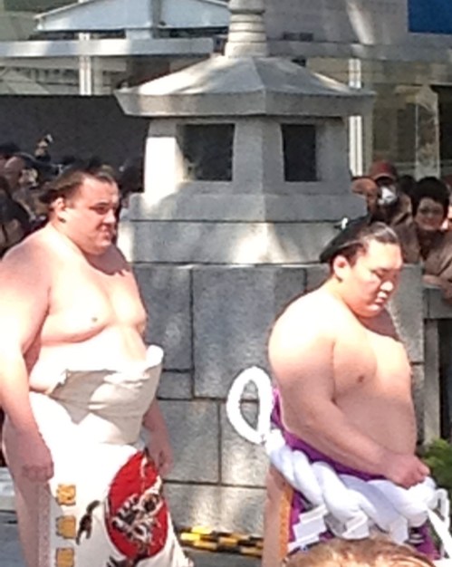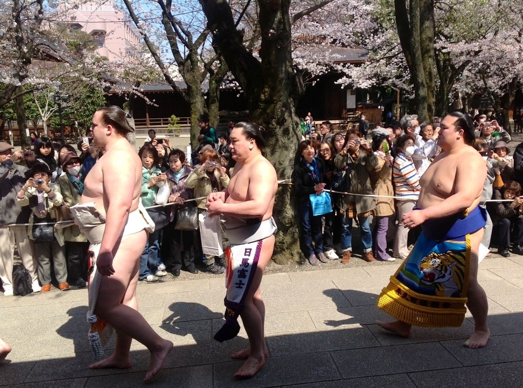 Spouse is a multi tasker. Therefore, he goes to Yasukuni Shrine where he can view cherry blossoms and his favorite sumo wrestlers at the same time. I was thrilled to hear he and Andretti-san were picked out of the crowd by sumo scouts as potential recruits based on the way they threw rival onlookers to the ground when storming their way to the front for a closer look.